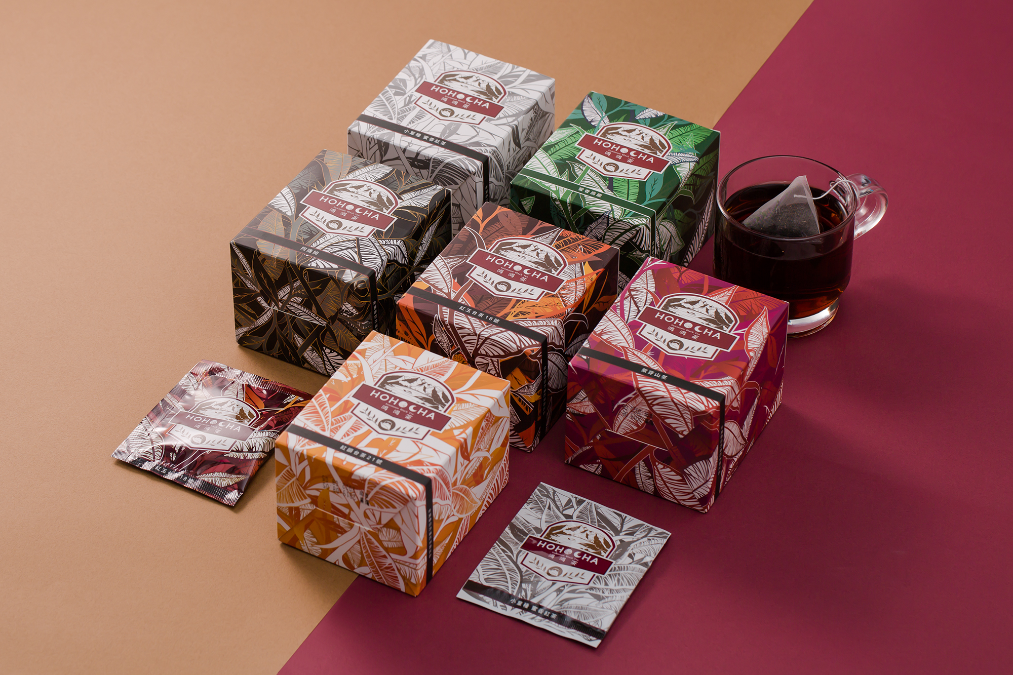 侑設計與 HOHOCHA 喝喝茶攜手推出首款茶包裝。 設計靈感源自「一心二葉」的茶之精華,以細膩插畫描繪葉脈紋理,化自然為藝術。 六種色彩代表六款茶品,各自散發專屬的風味與性格。
