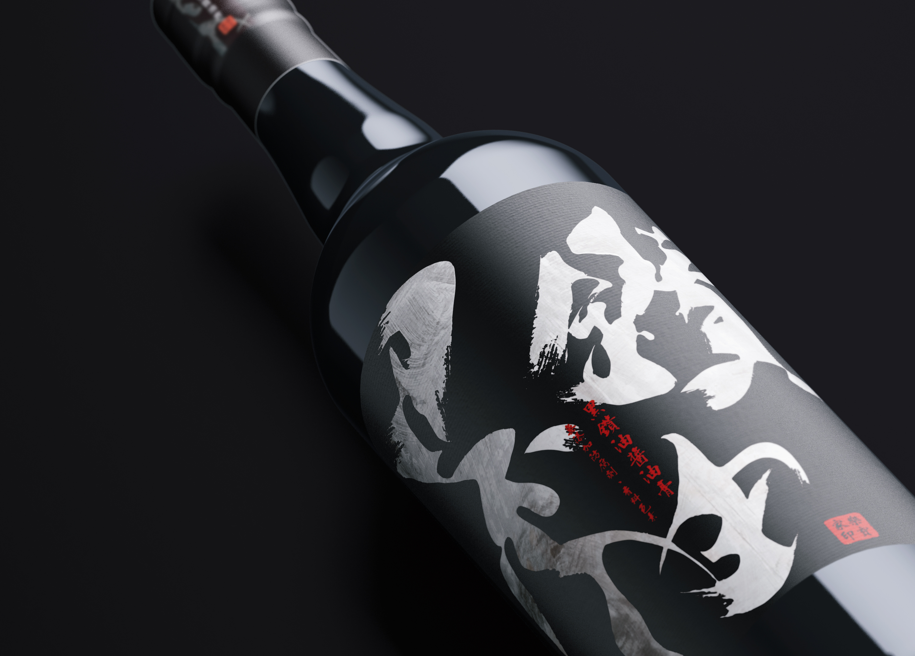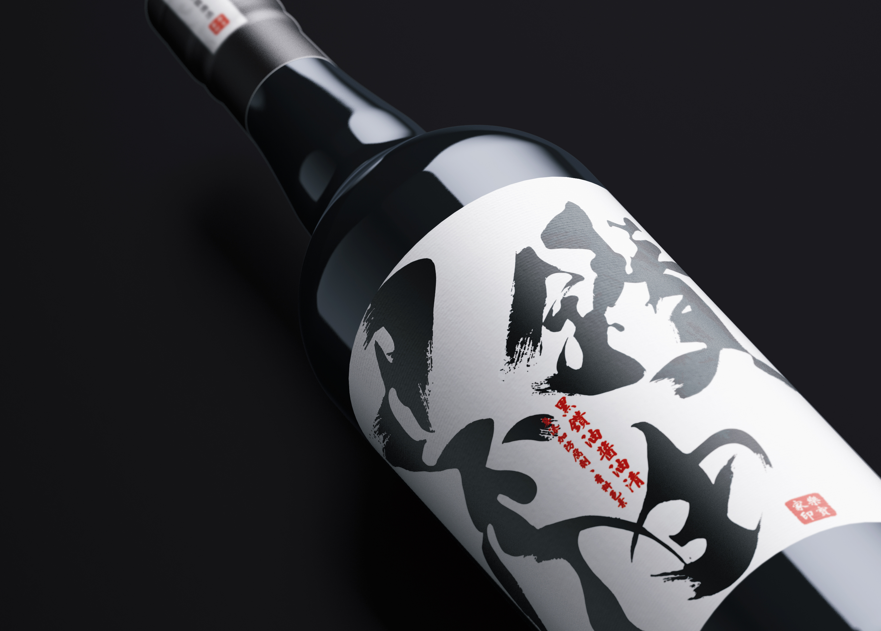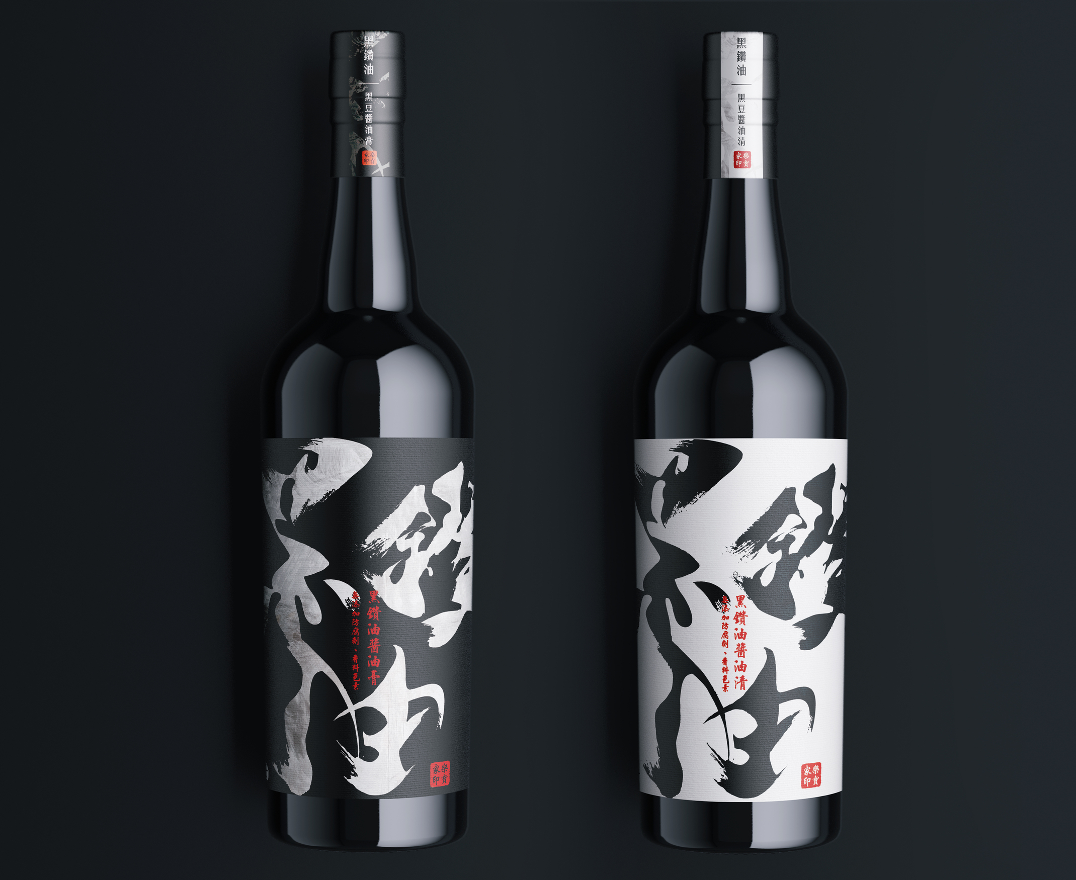 本設計以**「墨韻淬鍊」為核心,運用極具張力的現代書法筆觸,將醬油醇厚的流體感轉化為視覺藝術,並結合黑白極簡的「陰陽對比」建立精品級的層次感;輔以象徵品牌承諾的落款紅印**點睛,在留白與墨色的交織中,成功將傳統釀造工藝重塑為兼具東方底蘊與現代極簡質感的桌上藝術品。