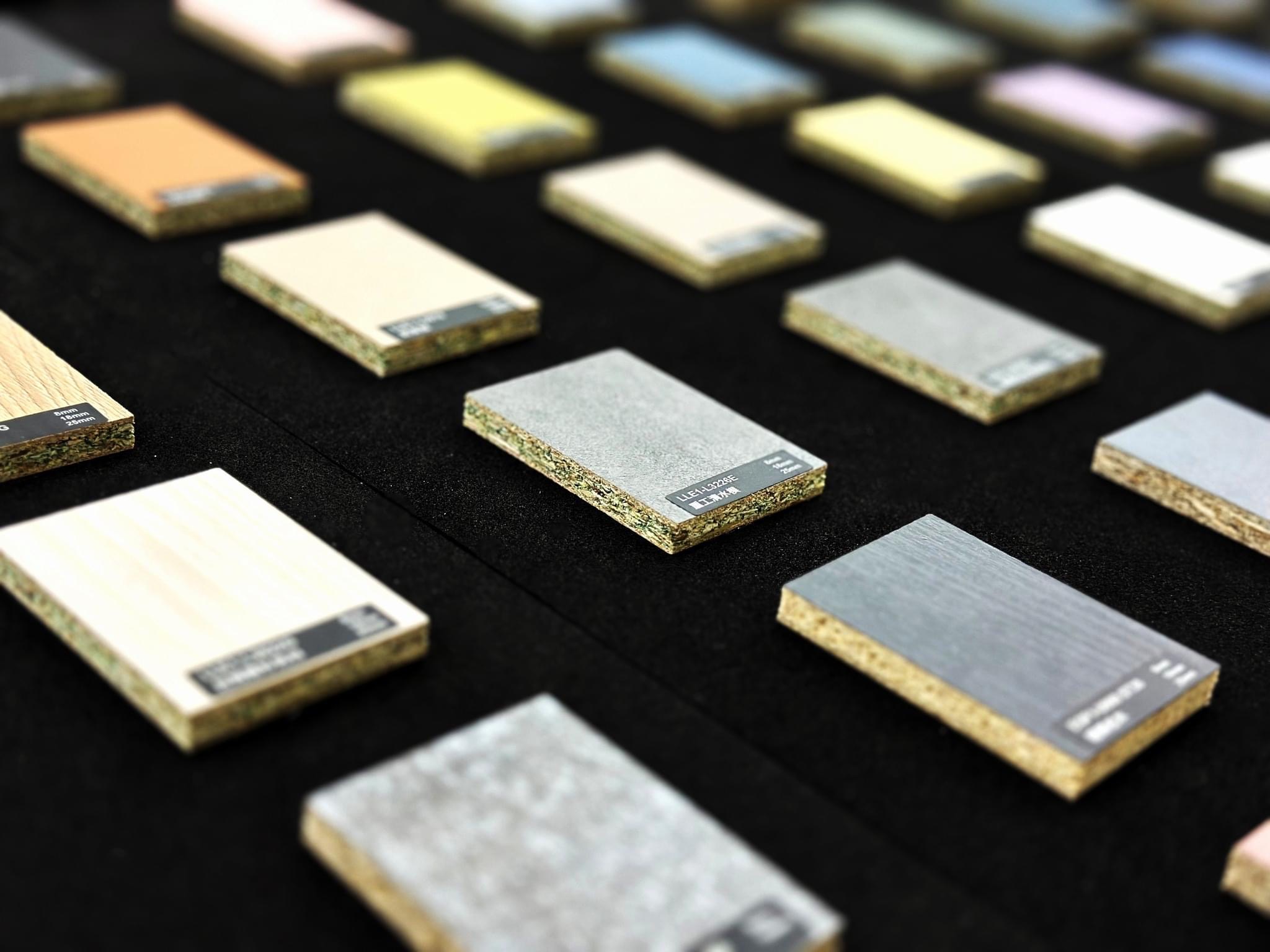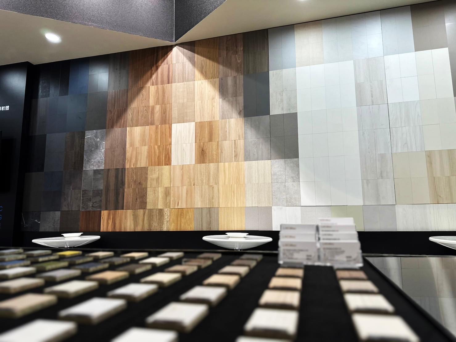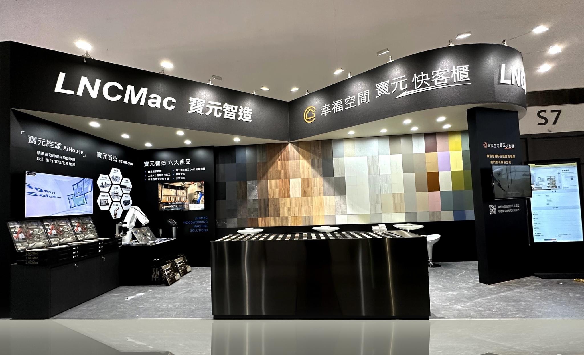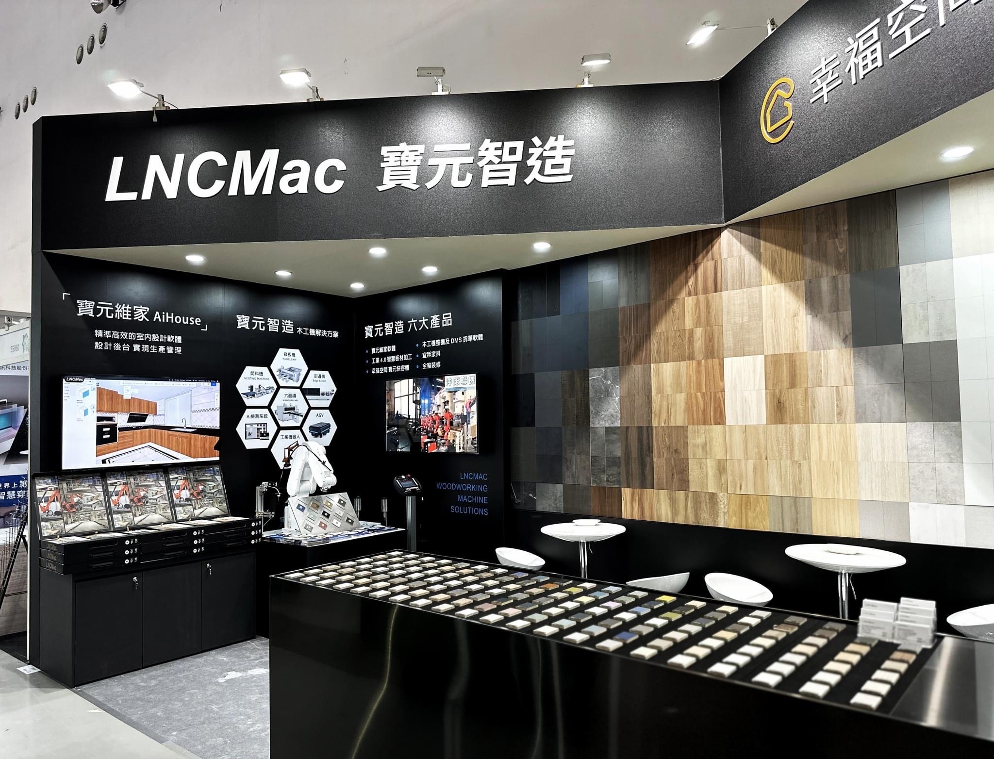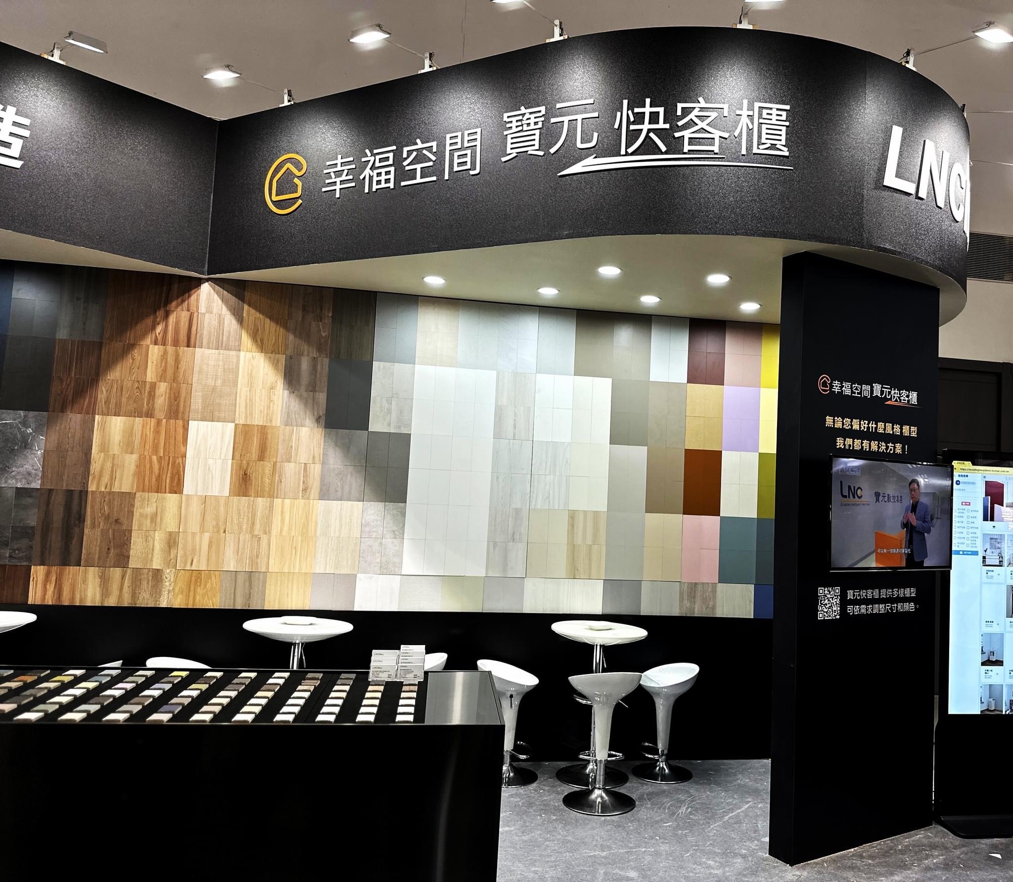 在這次「寶元智造 x 幸福空間」的展場設計中,我們試圖在「工業 4.0 的精準」與「居家空間的溫度」之間,構建一場理性的浪漫。 整體空間以極致的消光黑作為基底,象徵寶元(LNC)在數控技術上的精密與穩重;這不僅是展場的結構,更是一個安靜的舞台,讓主角——「材質」得以在其上盡情展演。 主視覺牆面我們打破了傳統的陳列方式,轉化為一面矩陣色譜牆(Pixelated Matrix)。利用不同色階與紋理的板材,如同馬賽克藝術般拼接,隱喻著系統櫃「模組化」的核心精神。 左側的機械手臂代表「智造」的硬實力,右側的色彩牆則演繹了「生活」的軟實力。透過設計語彙將兩者串聯,傳遞出品牌的核心哲學:因為有最精準的科技支撐,才能實現最自由的拼貼生活。